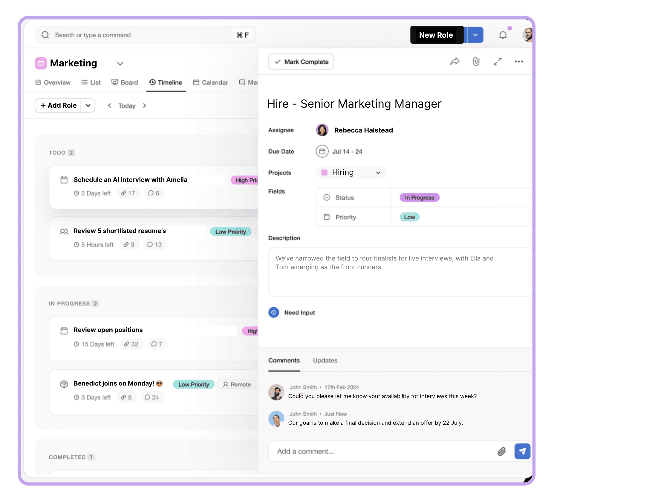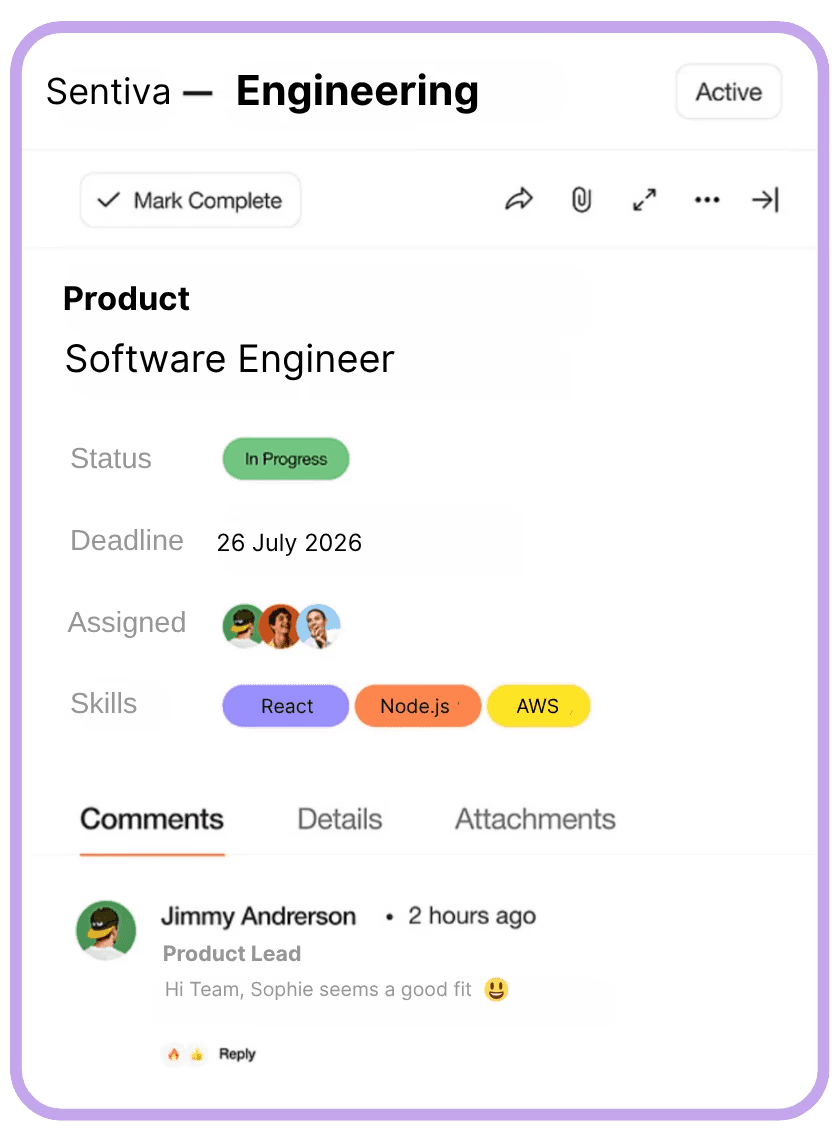 Inline comments, @mentions, and need-input flags keep recruiters, managers, and HR on the same page, right on the task itself.